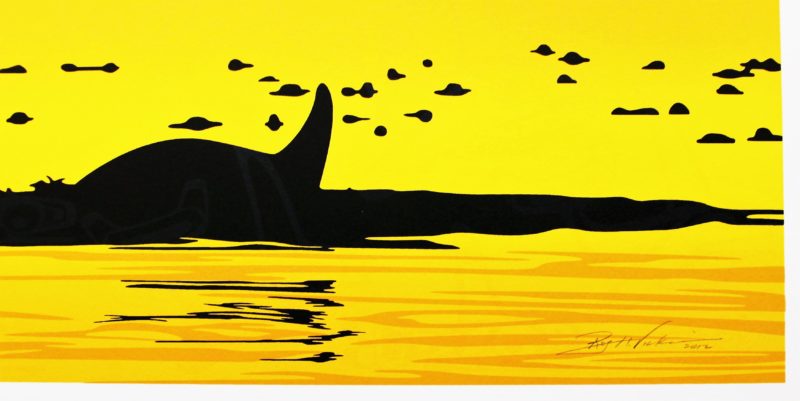 This limited edition silk screen print titled “Baby Orca” by Roy Henry Vickers was hand produced by the screen printing process. It is the only limited edition printing of this design. The artist has inspected and signed each copy in the edition. All trial copies of this edition have been destroyed and the printing stencils obliterated.