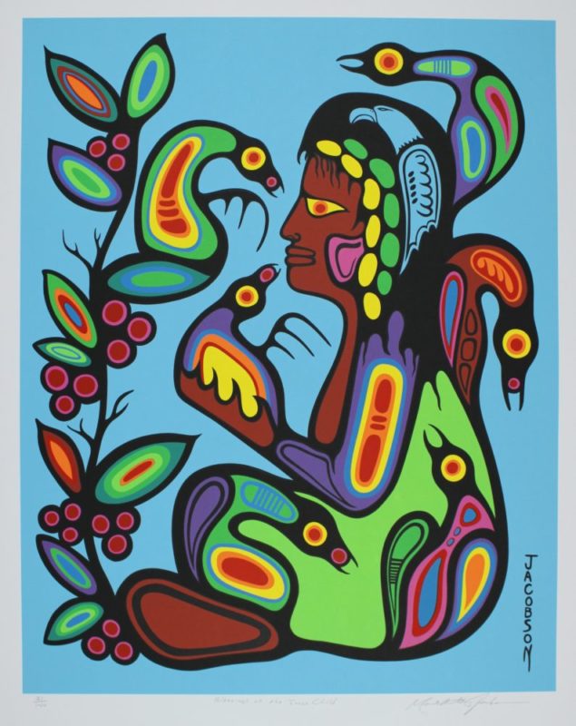 The painting depict’s a childlike figure being surrounded by birds. These birds represent our connection to our environment and in the painting, the birds have picked some berries from the plant being shown to reflect a nourishing and giving nature. The eagle spirit in the head of the main figure is reflective of the search and vision for inner freedom. This piece is a “medicine painting” for those of us (….) who are in need of the spiritual healing which is required with regard to our past experiences. It was and is an honour to share this “medicine” with all our relations.”