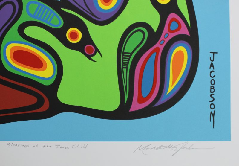 This limited edition silk screen print titled “Blessings of the Inner Child” by Mark Anthony Jacobson was hand produced by the screen printing process. It is the only limited edition printing of this design. The artist has inspected and signed each copy in the edition. All trial copies of this edition have been destroyed and the printing stencils obliterated.