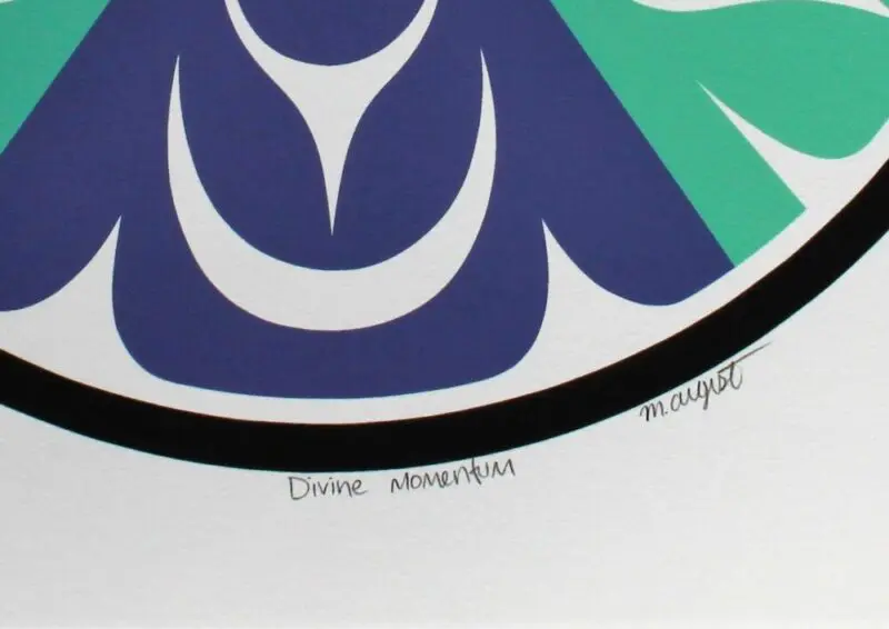 Divine Momentum is a limited edition screenprint by Coast Salish artist Margaret August. The design shows a Coast Salish spindle whorl that is striking in its vibrancy. Through this very contemporary and youthful interpretation, the artist is suggesting that Coast Salish cultures are prevailing in modern times.
