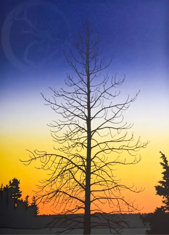Roy Vickers’ family lives mostly on wild game, so each fall he likes to travel to the Kootenays to hunt elk. One year, after a successful day, he noticed an old pine tree silhouetted against a beautiful sunset. While taking photos, the branches reminded him of a bull elk’s antlers, bringing back memories of years spent hearing elk bugle in the wilderness.
