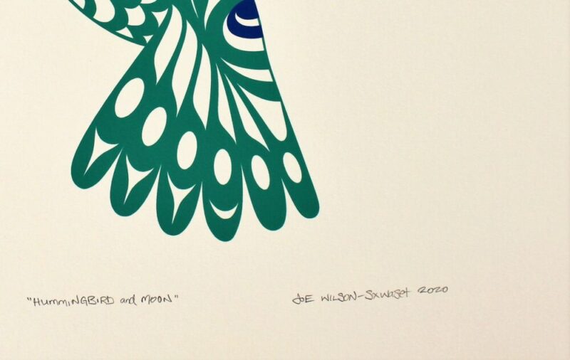 Hummingbird and Moon is a limited edition print by Joe Wilson. It shows the hummingbird hovering in mid air, face to the moon. In the moon, we see an owl, or eagle face. According to the artist, this is a matter of interpretation, and it makes sense to interpret the face of the moon as an owl, who are most active at night. The counterpart to this print, Hummingbird and Sun, would consequently feature the eagle face.