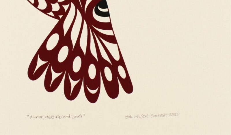 Hummingbird and Sun is a limited edition print by Joe Wilson. It shows the hummingbird hovering in mid air, face to the sun. In the sun, we see an eagle, or owl face. According to the artist, this is a matter of interpretation, and it makes sense to interpret the face of the sun as an eagle, who are most active during the day. The counterpart to this print, Hummingbird and Moon, would consequently feature the owl face.