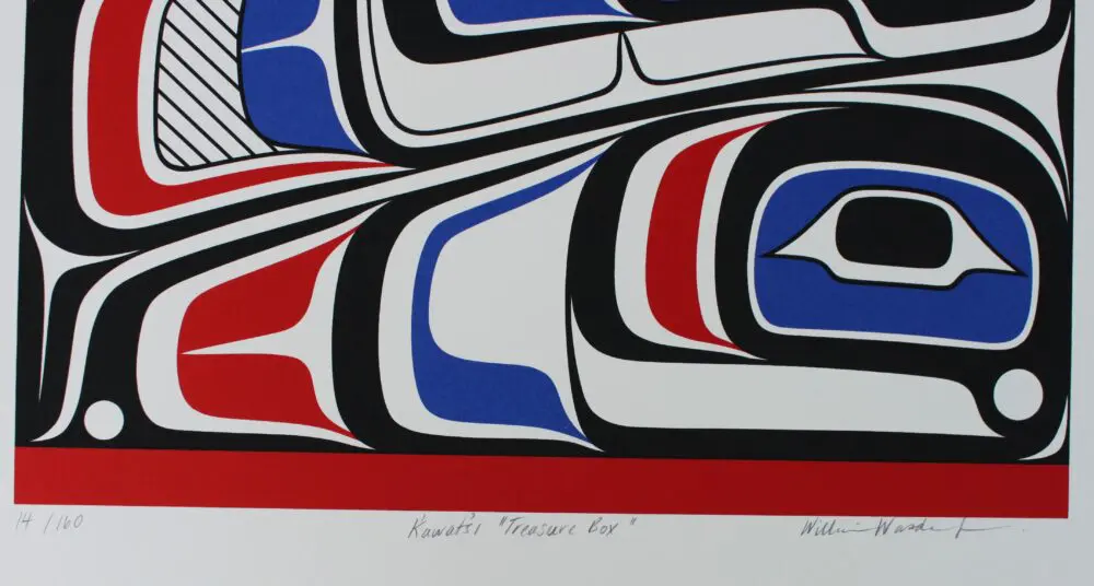 The Sax̱wsa̱m or “ovoid” is the subject of this box design and is a study on the individual styles of these four gifted artists and the symbolism of their designs. In Kwakwa̱ka̱’wakw art, when a supernatural creature had the ability to transform into human form, a human face or faces would be placed in strategic places on the artwork to display this ability. Sea creatures with this quality often included a fish-like face within the ovoids, whereas land beings and birds would show human faces within the ovoid design work. The incorporation of these ovoid fill designs are deliberate and serve to help tell the supernatural qualities of many ancestral beings through the artwork.
