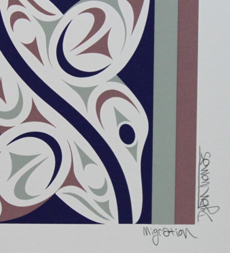 This limited edition silk screen print titled “Migration” by Dylan Thomas was hand produced by the screen printing process. It is the only limited edition printing of this design. The artist has inspected and signed each copy in the edition. All trial copies of this edition have been destroyed and the printing stencils obliterated.