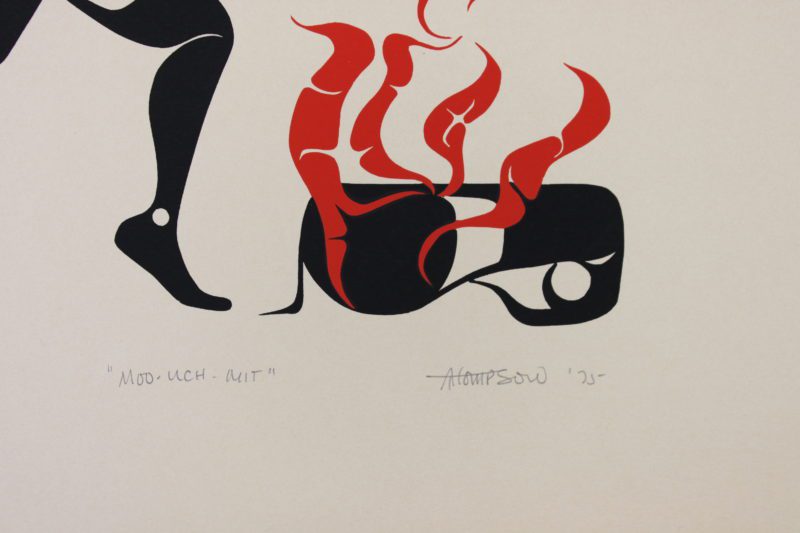 This limited edition silk screen print titled “Moo-Uch-Mit” by Art Thompson was hand produced by the screen printing process. It is the only limited edition printing of this design. The artist has inspected and signed each copy in the edition. All trial copies of this edition have been destroyed and the printing stencils obliterated.