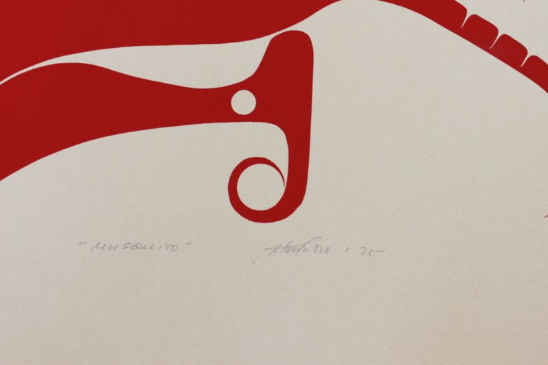 This limited edition silk screen print titled “Mosquito” by Art Thompson was hand produced by the screen printing process. It is the only limited edition printing of this design. The artist has inspected and signed each copy in the edition. All trial copies of this edition have been destroyed and the printing stencils obliterated.