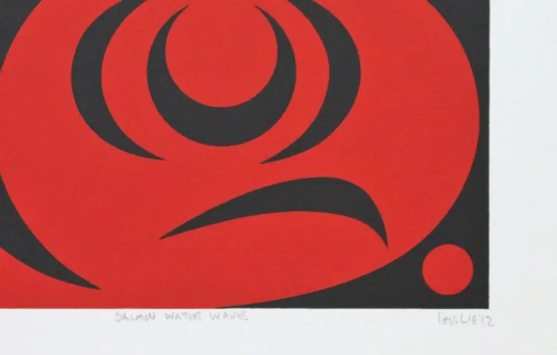 This limited edition silk screen print titled “Salmon Water Waves” by lessLIEwas hand produced by the screen printing process. It is the only limited edition printing of this design. The artist has inspected and signed each copy in the edition. All trial copies of this edition have been destroyed and the printing stencils obliterated.