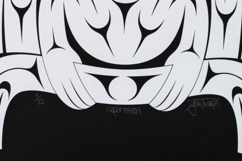 This limited edition silk screen print titled “Super Natural” by Dylan Thomas was hand produced by the screen printing process. It is the only limited edition printing of this design. The artist has inspected and signed each copy in the edition. All trial copies of this edition have been destroyed and the printing stencils obliterated.
