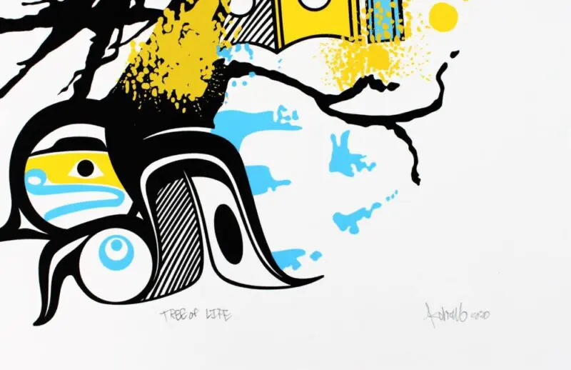 The Tree Of Life is KC Hall’s second limited edition serigraph. The design combines contemporary street art with formline. The colours and shapes are reminiscent of Chilkat weaving, while the spray paint splatter and overall arrangement of forms gives it an urban feel.