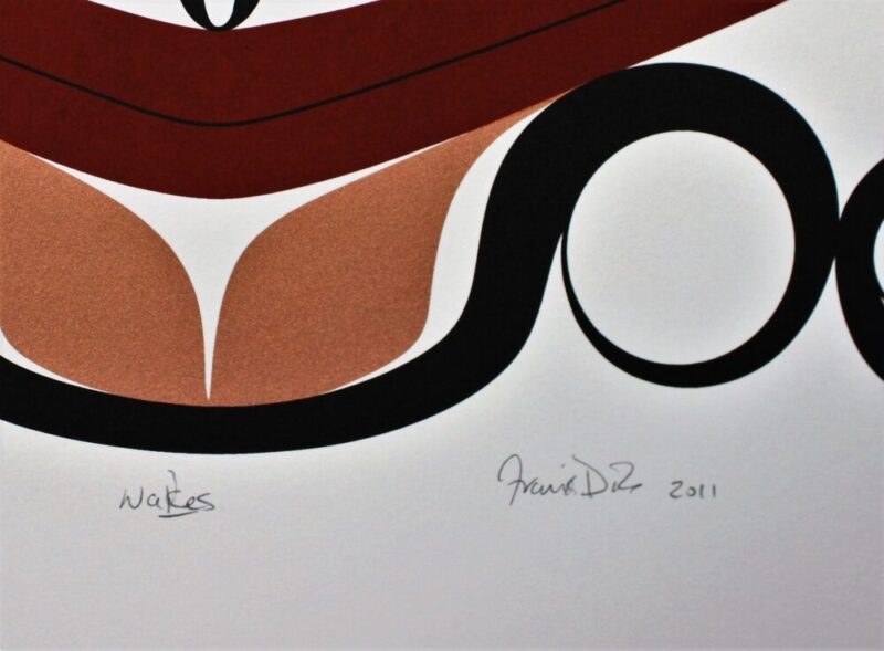 This limited edition silk screen print titled “Wak’es” by Francis Dick was hand produced by the screen printing process. It is the only limited edition printing of this design. The artist has inspected and signed each copy in the edition. All trial copies of this edition have been destroyed and the printing stencils obliterated.